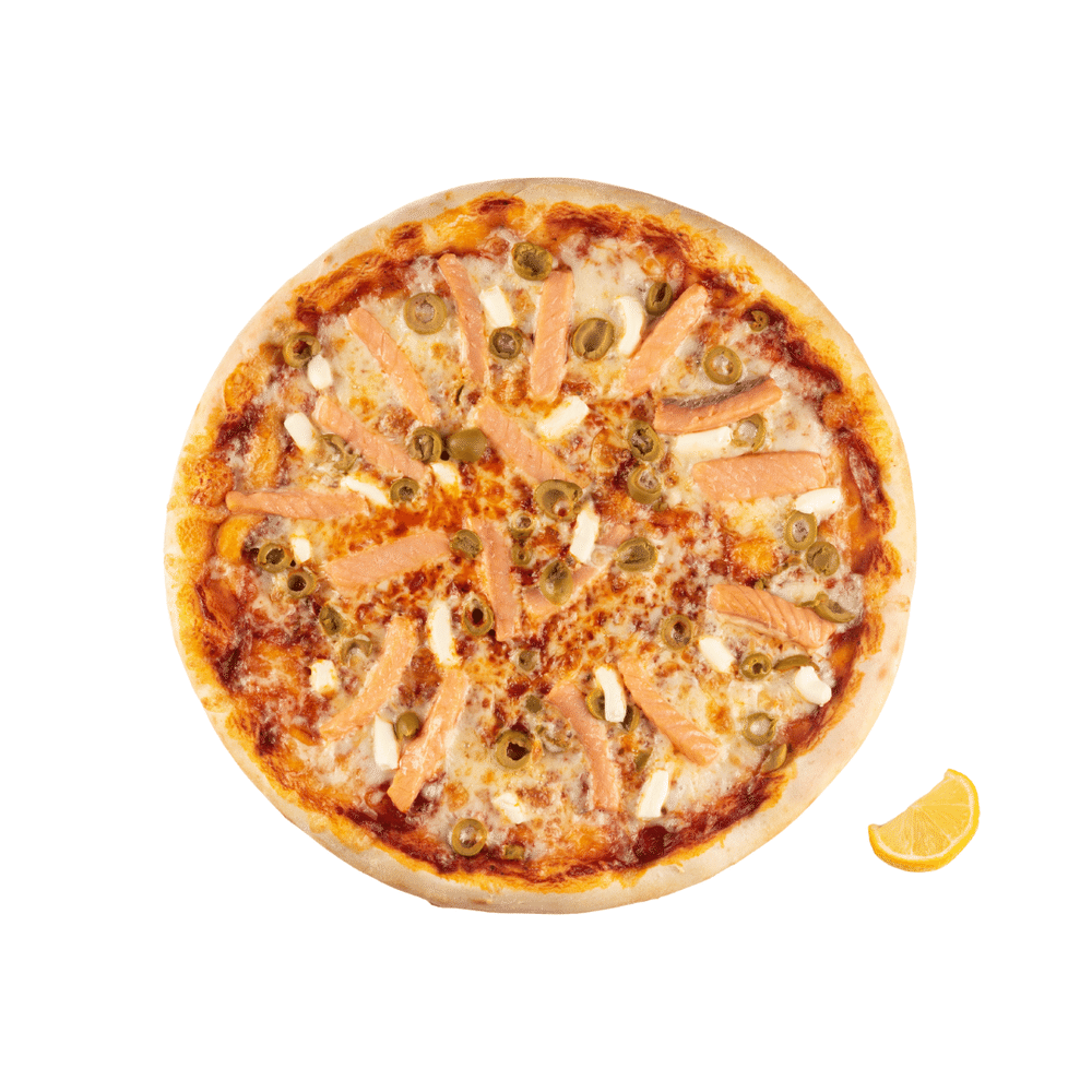 Соус томатный, моцарелла, форель слабосоленая, крем-чиз, оливки, лимон