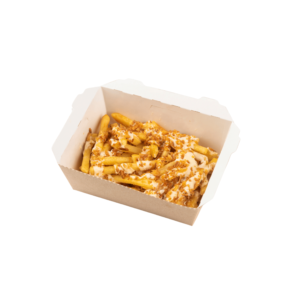 Картофель фри, жареный лук и чесночный соус