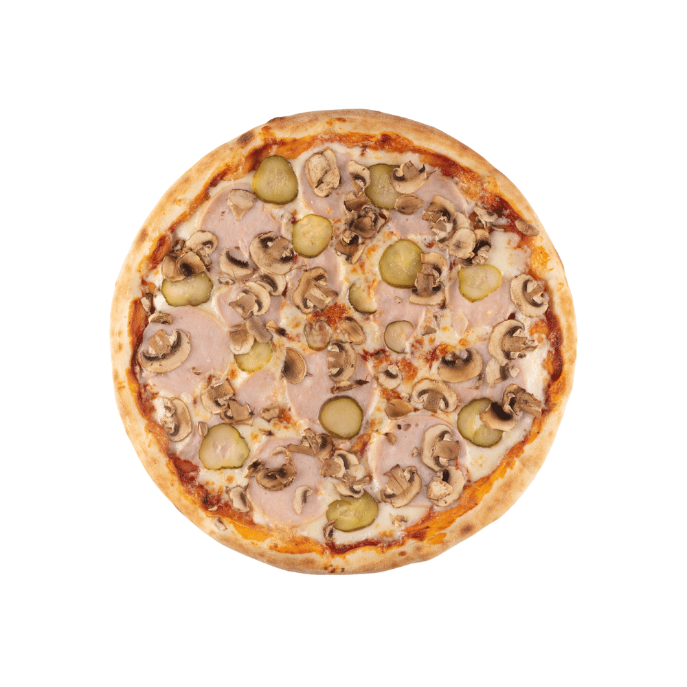 Соус томатный, моцарелла, ветчина, шампиньоны, огурец маринованный