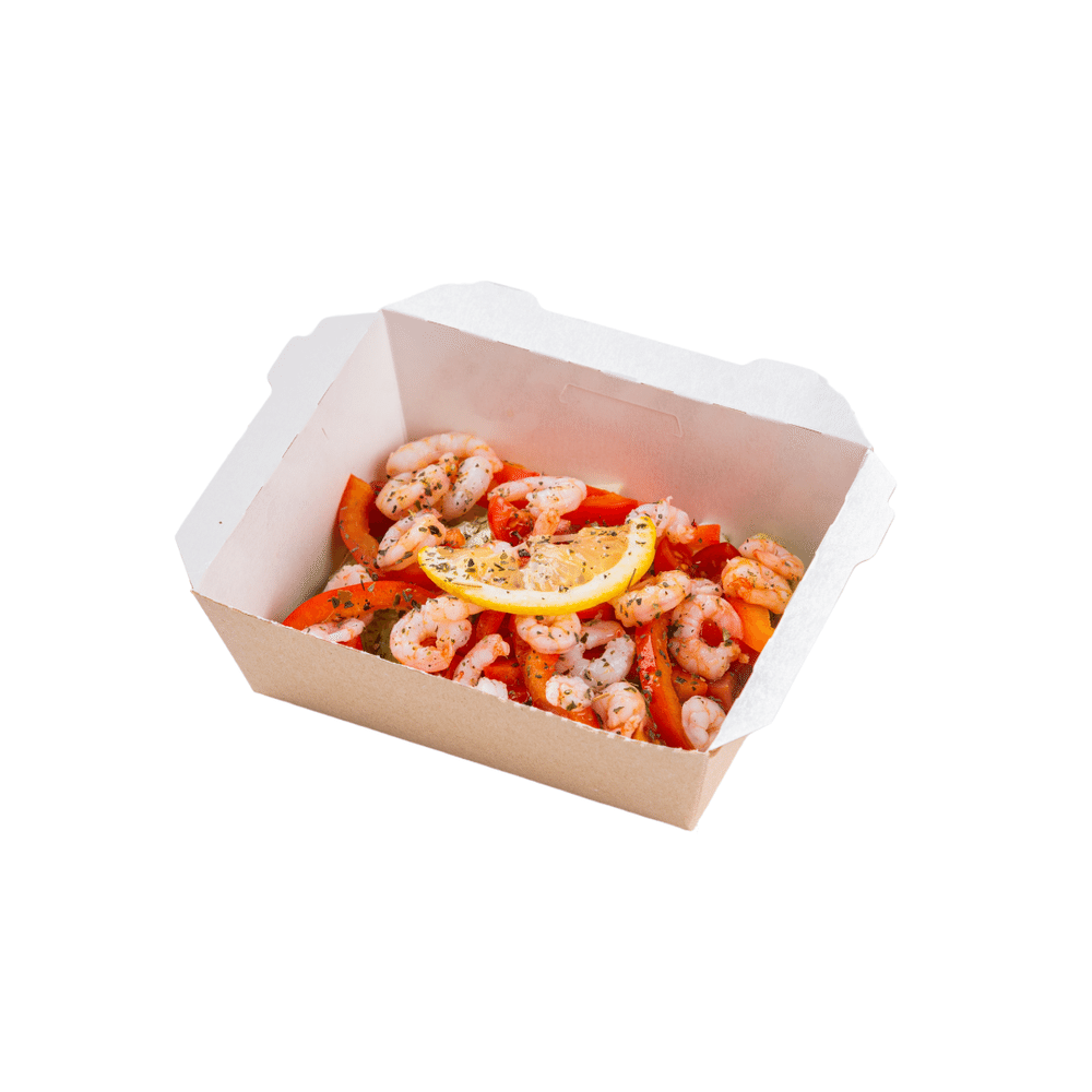 Салат айсберг, томат, перец свежий, креветки маринованные, лимон, фирменная заправка