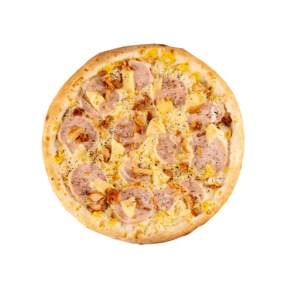 соус сырный, моцарелла, мясо цыплёнка, ветчина, ананас, базилик