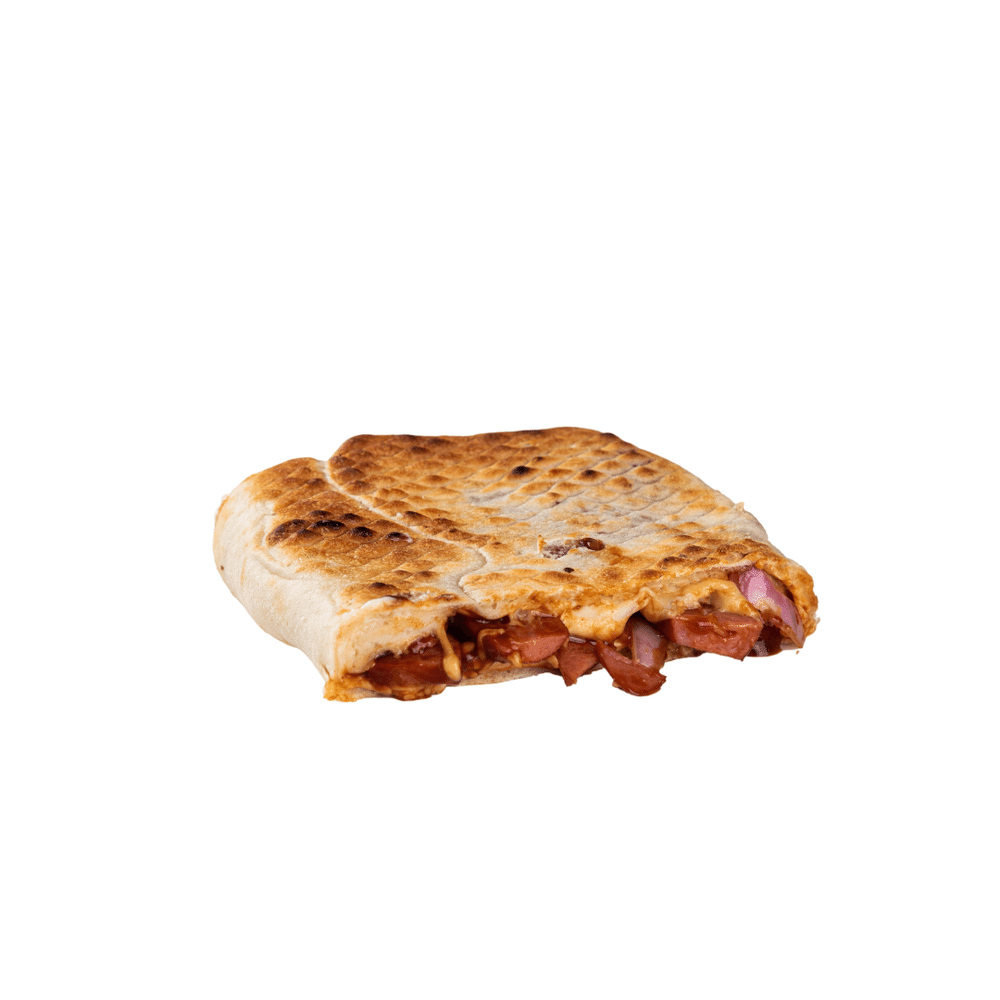 Тесто, соус барбекю, моцарелла ,колбаски мексиканские, лук фиолетовый