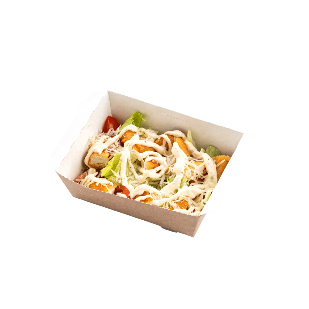 Салат Айсберг, томат черри, наггетсы, сыр Пармезан, соус чесночный
