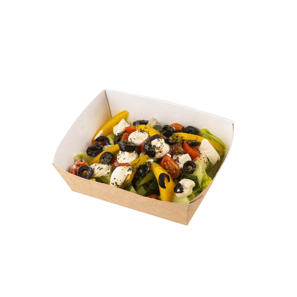 Салат Айсберг, перец свежий, огурец свежий,томат черри, сыр крем-чиз, маслины, фирменная заправка