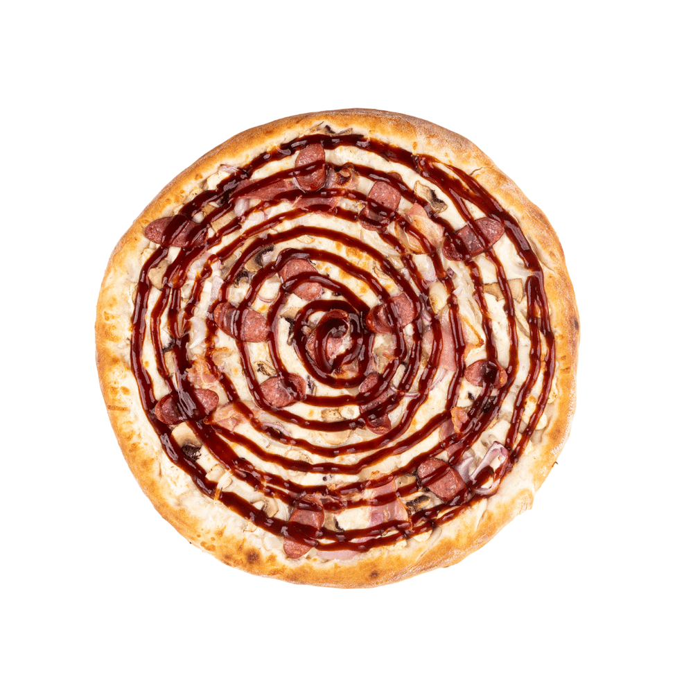 Соус чесночный, сыр моцарелла, бекон, колбаски мексиканские, шампиньоны, черри, лук, соус BBQ