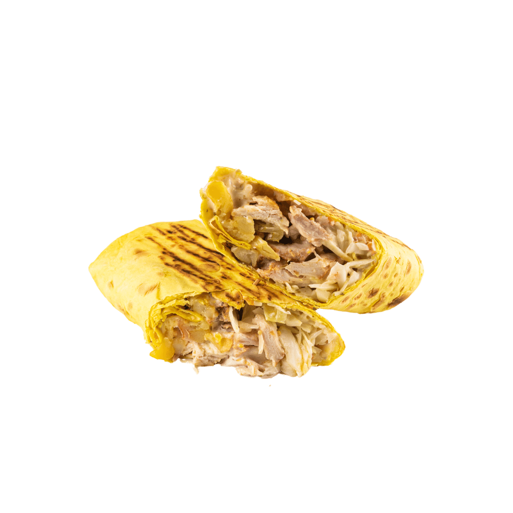 Сырный лаваш, соус фирменный, курица, бекон, фри, огурец свежий, морковь по-корейски, капуста