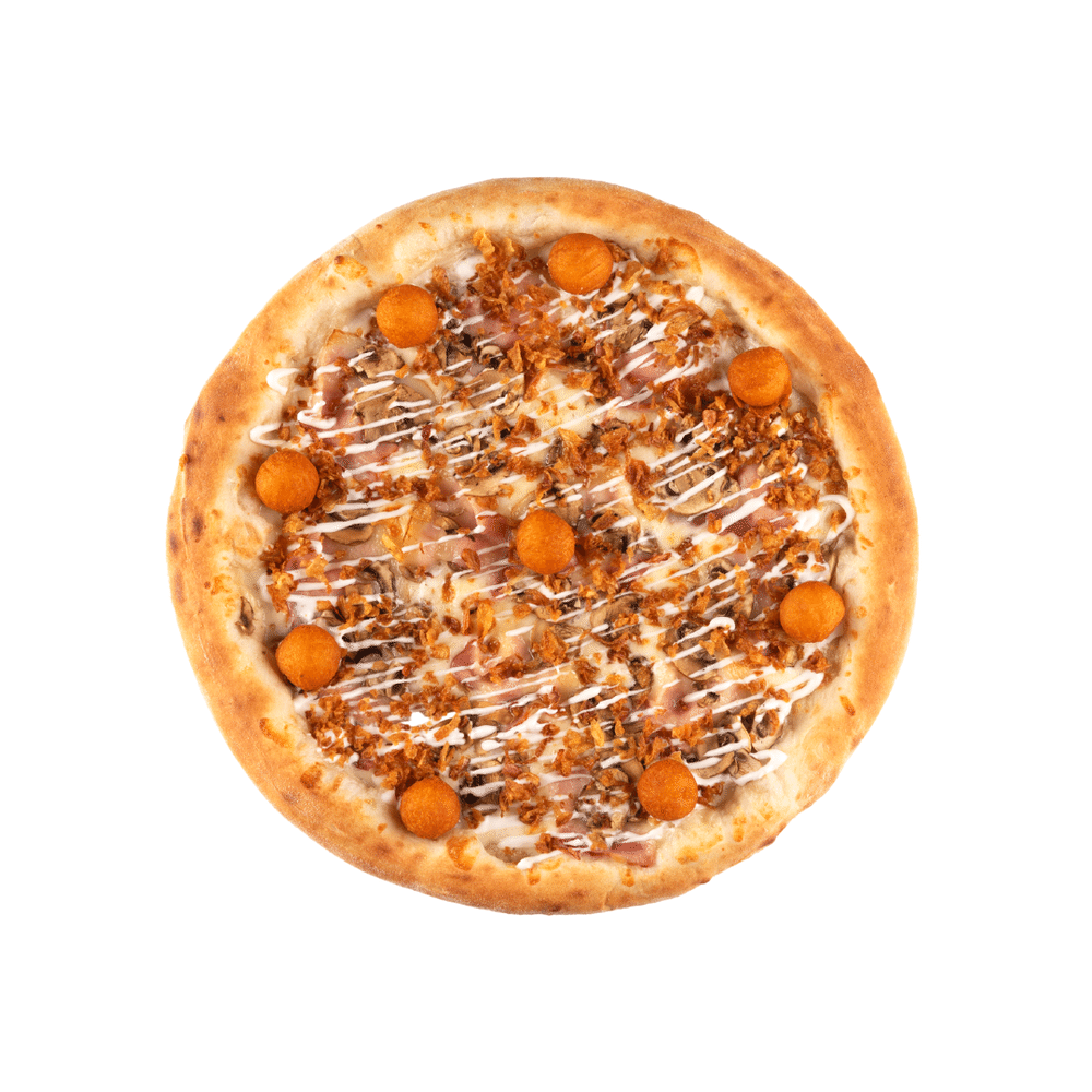 Соус чесночный, много моцареллы, бекон, шампиньоны, картофельные шарики, жареный лук