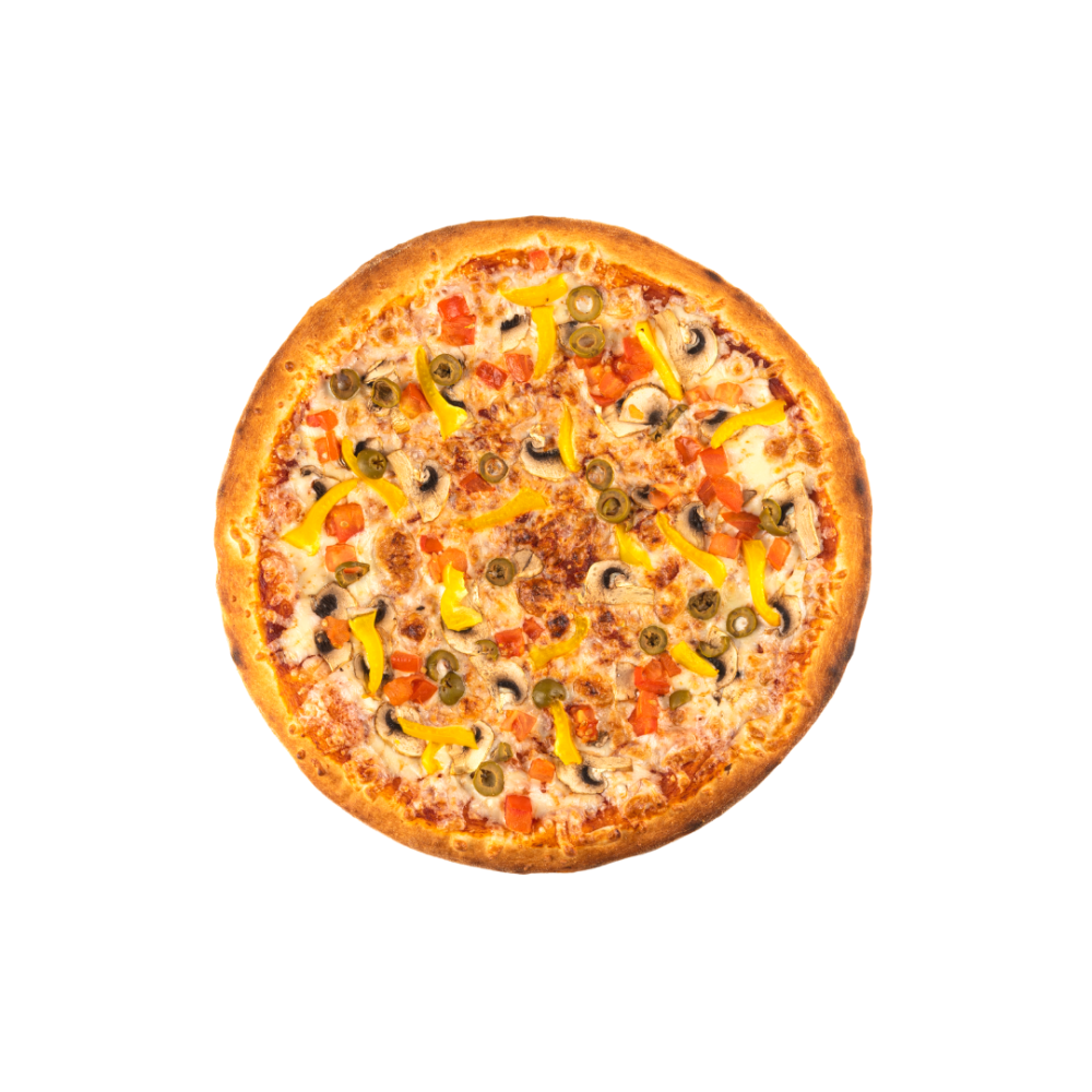 Соус томатный, моцарелла, шампиньоны, помидор свежий, перец свежий, оливки