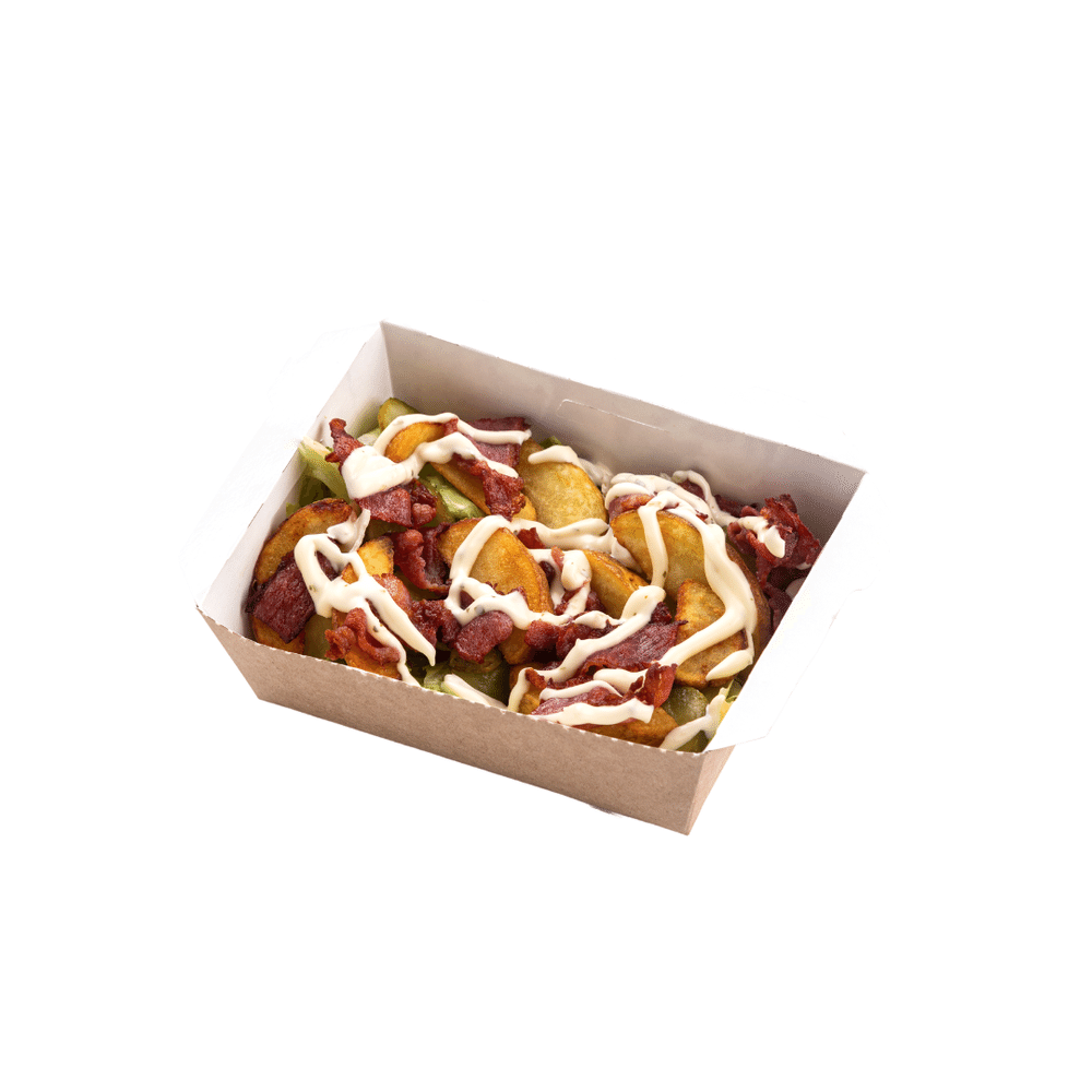 Салат Айсберг, картофельные дольки, огурец маринованный, бекон жареный, соус чесночный