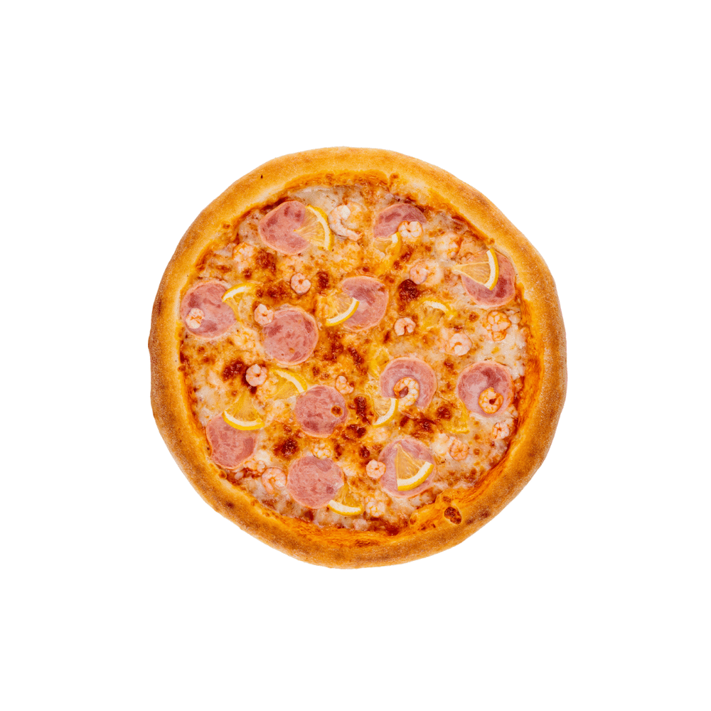 Моцарелла, ветчина, маринованные креветки, лимон, соус томатный
