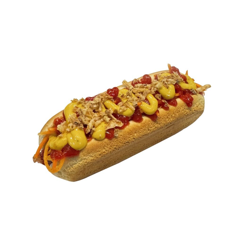 Булочка, соус фирменный, колбаска, морковь по-корейски, соус кетчуп, соус горчичный, лук жаренный